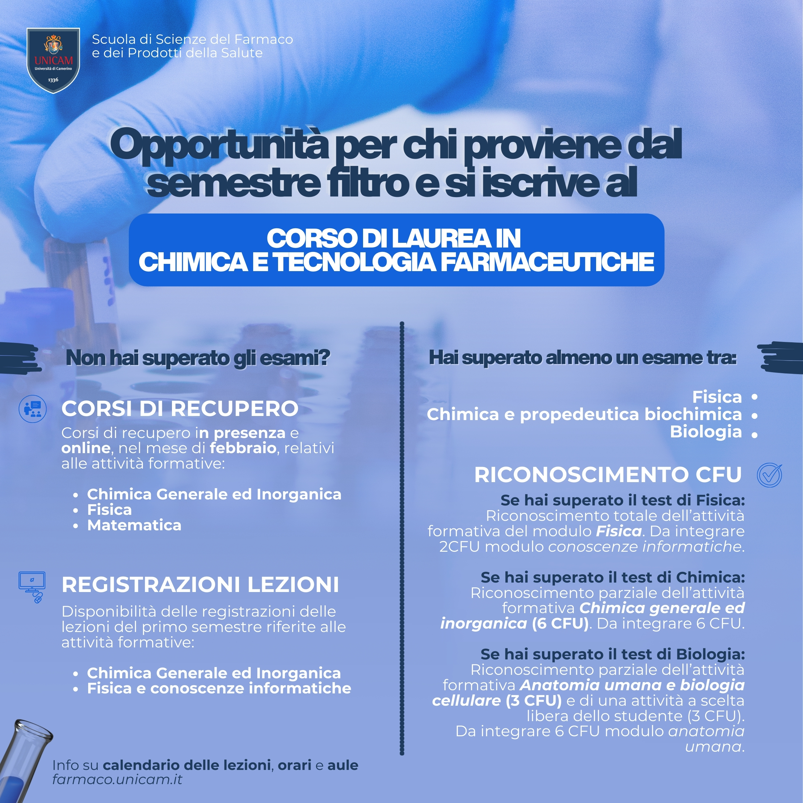 Opportunità per chi proviene dal semestre filtro e si iscrive al CdL in Chimica e Tecnologia Farmaceutiche